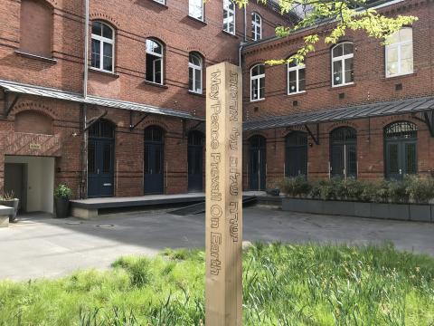 "Möge Frieden auf Erden sein" - dieser Satz ist in Deutsch, Englisch, Arabisch und Hebräisch auf die vier Seiten eines in einen Fichtenstamms gebrannt, den die Kantorin Esther Hirsch, Imam Kadir Sanci und Pfarrer Gregor Hohberg gemeinsam vor dem Pavillon auf dem Petriplatz aufgestellt haben.