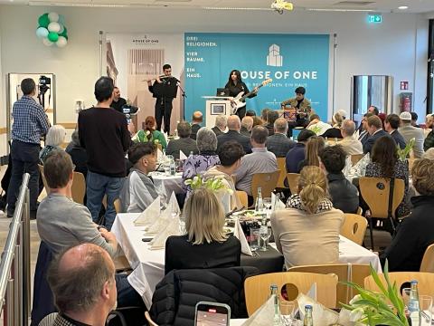 Anna-Nicole Heinrich, Präses der Synode der Evangelischen Kirche Deutschland (EKD), bekräftigte die Worte des Imams in ihrem Grußwort: „Gerade in diesen Zeiten braucht es Formate, die Menschen verschiedener Religionen einladen und zusammenbringen. Tische, an denen gemeinsam gegessen, miteinander gesprochen und einander zugehört wird. An einem Tisch sitzen: Darin liegt eine tiefe Symbolik des Miteinanders, des Austauschs, des gegenseitigen Respekts, des Zuhörens.“ Der Krieg im Gaza-Streifen wirke sich bis nach Deutschland auf das Miteinander von jüdischen, christlichen und muslimischen Menschen aus. "Wir spüren Anspannung auf allen Ebenen, erleben Antisemitismus und anti-muslimischen Rassismus in erschreckender Form." Gerade jetzt brauche es Formate, die Menschen verschiedener Religionen zusammenbringe. Und es brauche Vorbilder, die das verständnisvolle Miteinander vorleben. "Es beeindruckt, was das House of One als Institution und im Schulalltag mit seinen multireligiösen Teams leistet."
